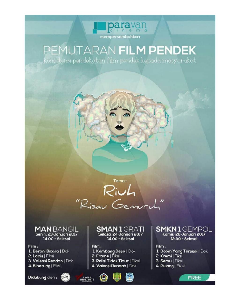 [:en]Kabar membanggakan kembali hadir dari mahasiswa program studi televisi dan film. Tak tanggung-tanggung, tiga film sekaligus berhasil masuk dalam program pemutaran ini. “Lapis”, film yang disutradarai oleh Nur Hadi, diputar di kota pasuruan dalam rangka road show film yang diselenggarakan oleh Paravan Cinema. Dalam program konsistensi pendekatan film pendek kepada masyarakat, Paravan Cinema mempersembahkan pemutaran film yang bertajuk “Riuh, Risau, Gemuruh”. Tak hanya “Lapis”, Banyak film pendek lain yang masuk dalam pemutaran ini.